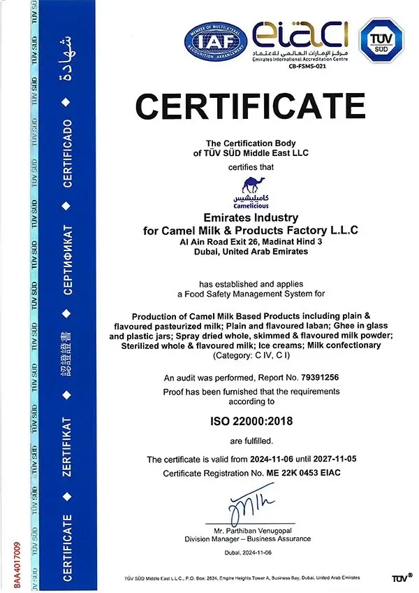 Emirates Industry for Camel Milk & Products社は、ドバイにございます。 品質管理も徹底されており、安心のISO22000の基準に基づいて製造がされております。